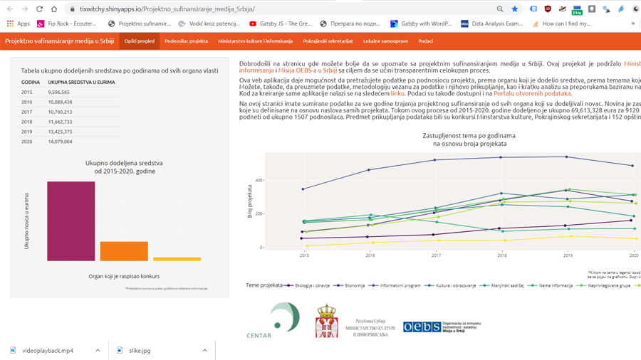 Pomoću aplikacije "Projektno sufinansiranje medija u Srbiji" imate mogućnost da pregledate rezultate konkursa državnih organa za sufinansiranje javnog interesa u sferi javnog informisanja od 2015. do 2020. godine. Izradu aplikacije podržalo je Ministarstvo kulture i informisanja i Misija OEBS-a u Srbiji sa ciljem da se učini transparentnim celokupan proces konkursnog sufinansiranja.